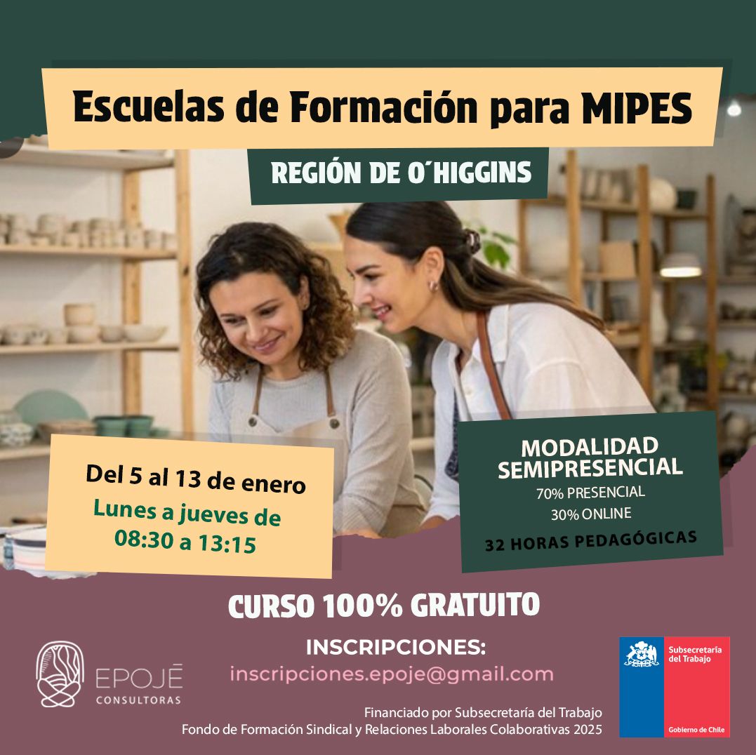 Invitamos a dueños/as y trabajadores/as de emprendimientos a participar del curso gratuito: Escuela de Formación para MIPES: Línea emprendedores/as, ejecutado por Epojé Consultoras y desarrollado en la región de O’Higgins.